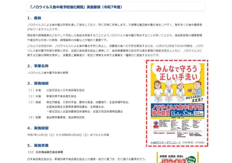 一人ひとりが注意をしていても、現場全体で共通意識を持てなければ効果は限定的です。下記リンク先の赤枠内、「A4版ポスターダウンロード」をクリックの上、ぜひ職場の皆様の目に入りやすい場所に掲示や配布をしていただき、ノロウイルスによる食中毒予防の意識づけにご活用ください。