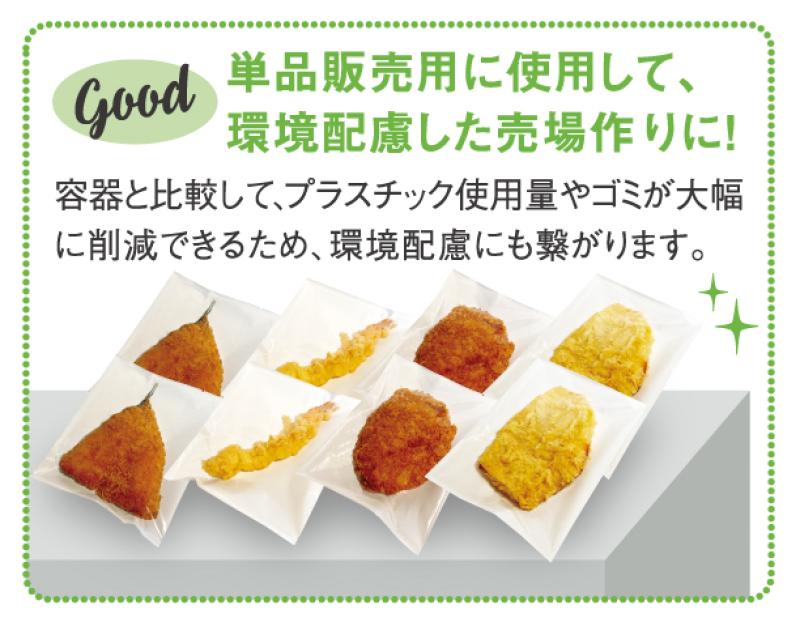 最近のスーパーでは、新型コロナウイルスの緩和を受け、お総菜のバラ販売が再開しています。そんな時にオススメなのがフライバックです!!フライバックは、消費者の方自身で商品を入れるため、店員さんの作業軽減にもつながります!!また、紙とフィルムを使いながらも、お総菜がおいしそうに見えるように工夫しています。