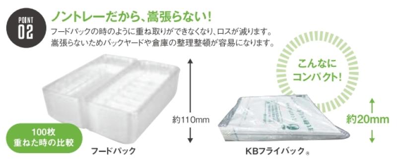 ①フードパックと比較し、KBフライバックは燃焼時のCO₂排出量が70%~80%削減することができ、丸めて捨てられます。そのため、家庭のごみを削減して、環境に配慮した製品となっております。②プラスチックの容器と比べて、フライバックは紙を使用しており、重量比が軽いため、容器リサイクル法負担額を削減することができます。