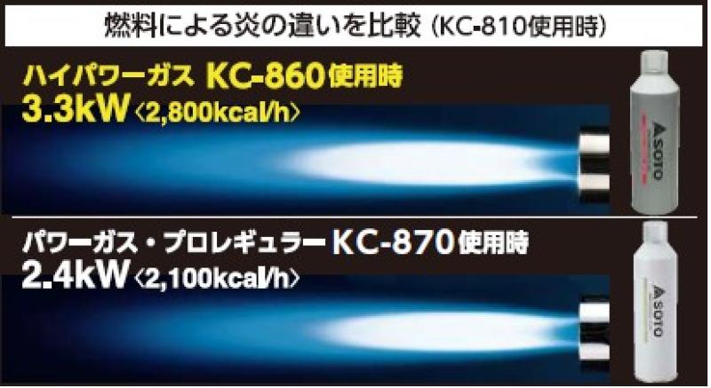 画像は、プロパンが20%配合されたKC-870と比較した様子。火力の違いをおわかりいただけるでしょうか。液化ブタン100%のボンベと比べるとより、違いは明確です。