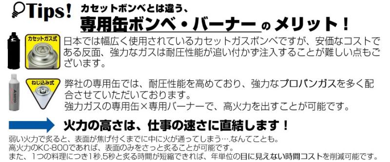 ・「KC-860」は、ねじ込み式のボンベとなっており、弊社で専用の炙り用料理バーナーをご用意しております。