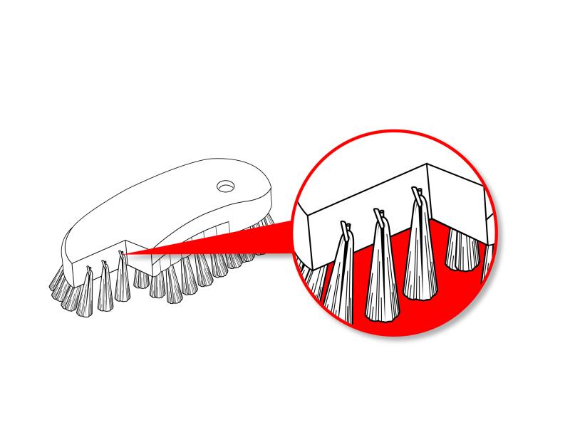 また、毛材の形状として当社オリジナルの“三角繊維”を採用。他ブラシとの差別化が可能で、汚れ落ちの良さの向上に加え、万が一の異物混入発生時にも他社ブラシと区別がしやすく、追跡作業が容易です。