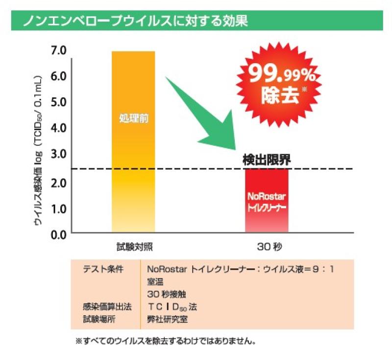 さらに、通常のトイレ洗剤では“菌には効くがウイルスには効果がない”ものが多い中で、NoRostarトイレクリーナーはウイルス不活化まで対応。幅広いウイルスに対して除去・不活化効果を確認済みです。