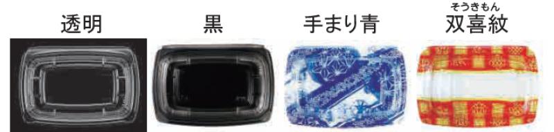 柄展開は透明・黒・手まり青・双喜紋の4種類。定番の透明、洋食メニューに合う黒、和食メニューに合う手まり青、中華総菜には双喜紋など、