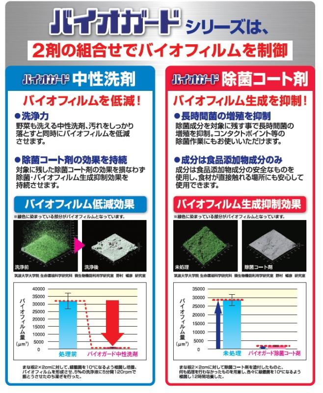バイオガードシリーズ2剤(中性洗剤・除菌コート剤)の組み合わせでバイオフィルムを制御。