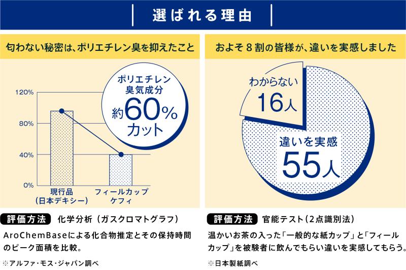 お飲み物のはいった「一般的な紙カップ」と「フィールカップケフィ」を比較してみてください。お試しの際は、紙カップの匂いが最も感じやすいと言われているホット飲料をおすすめしております。