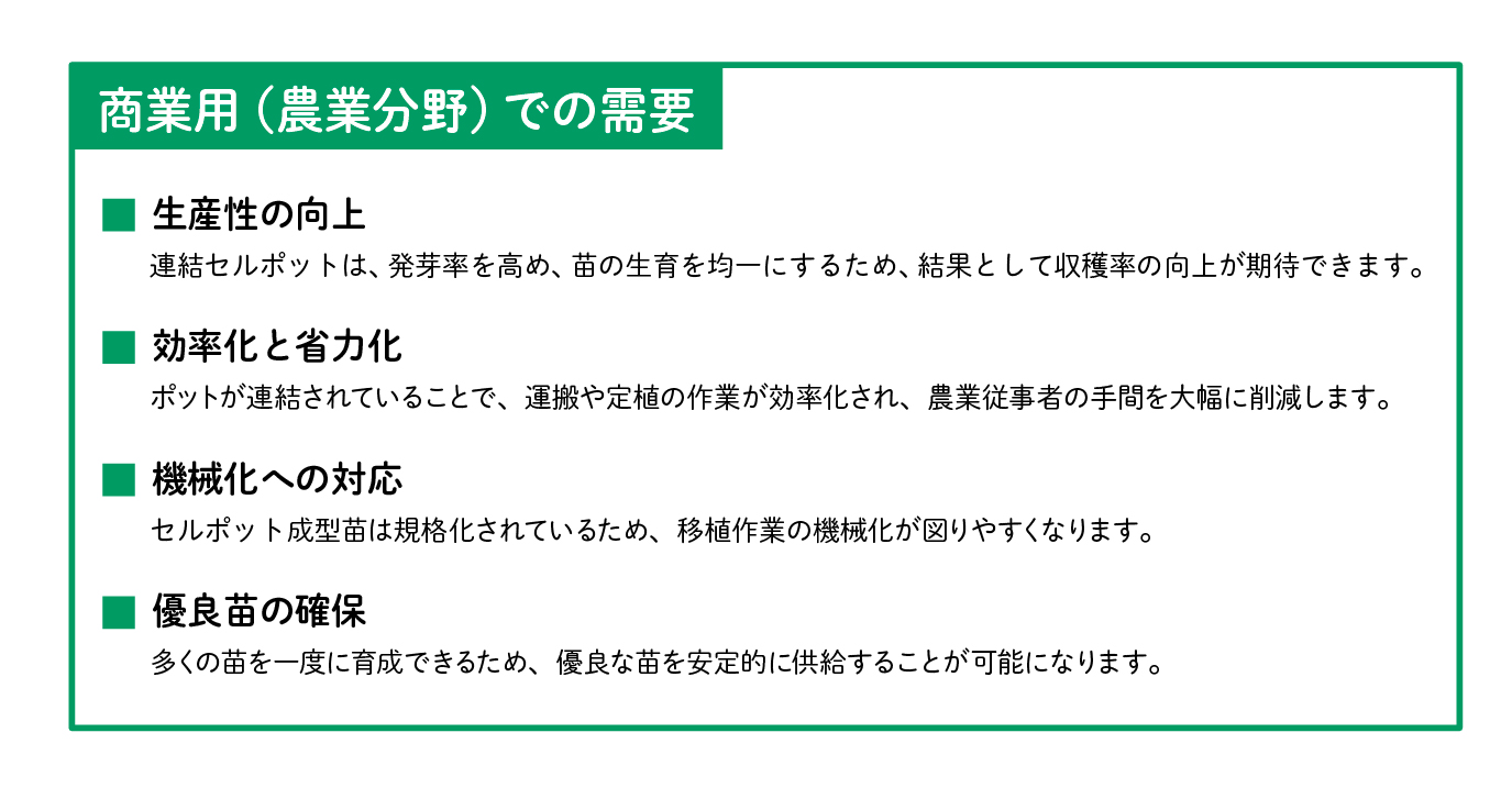 連結セルポットは、発芽率を高め、苗の生育を均一にするため、結果として収穫率の向上が期待できます。