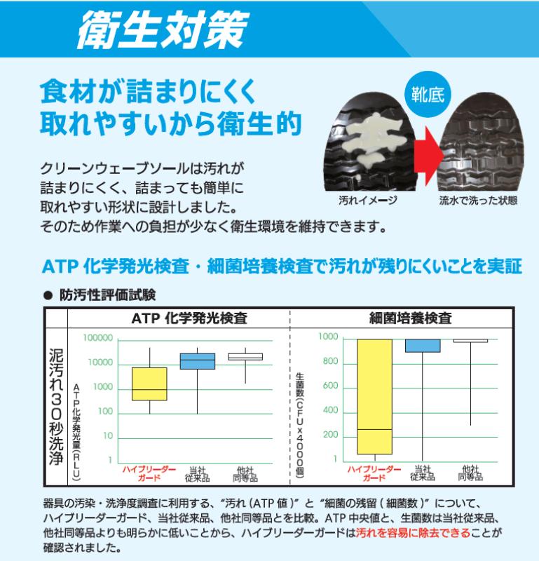 従来の深溝ソールは、野菜片や肉片、粘性の汚れが入り込むと除去が大変で、詰まりが残ったまま歩けば接地面が平らになって耐滑性も低下します。対してハイブリーダーガードのクリーンウェーブソールは、汚れが入り込みにくく、付着しても水洗いと軽いこすりで素早く落ちる形状設計。
