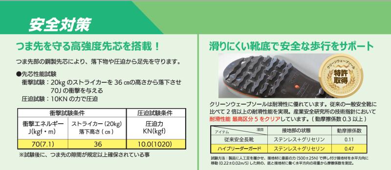 「溝が少ない=滑りやすいのでは?」という不安に対し、同ソールは従来の一般安全靴に比べて2倍以上の耐滑性能を実現。また、産業安全研究所の技術指針において耐滑性能 最高区分5をクリアしております。(動摩擦係数3以上)