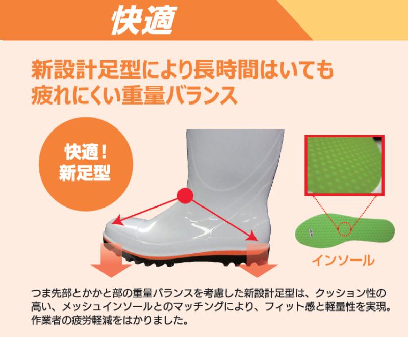 長靴や安全靴、厨房靴をご使用されるお客様では、「疲れる」など作業者の負担を問われるケースも少なくありません。ハイブリーダーガードは、新設計足型により長時間履いても疲れにくい重量バランスを実現しております。