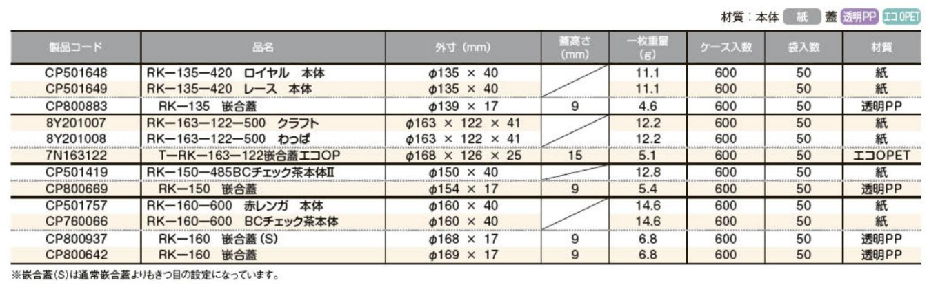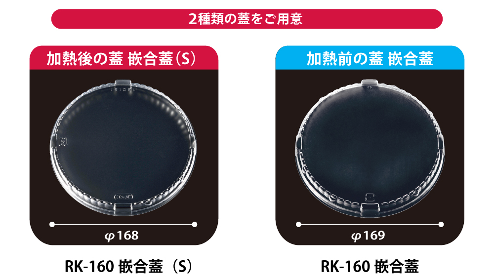 紙容器は加熱すると縮むため、RK-160シリーズでは、加熱後も蓋がしっかりとはまるよう、2種類の蓋をご用意しています。