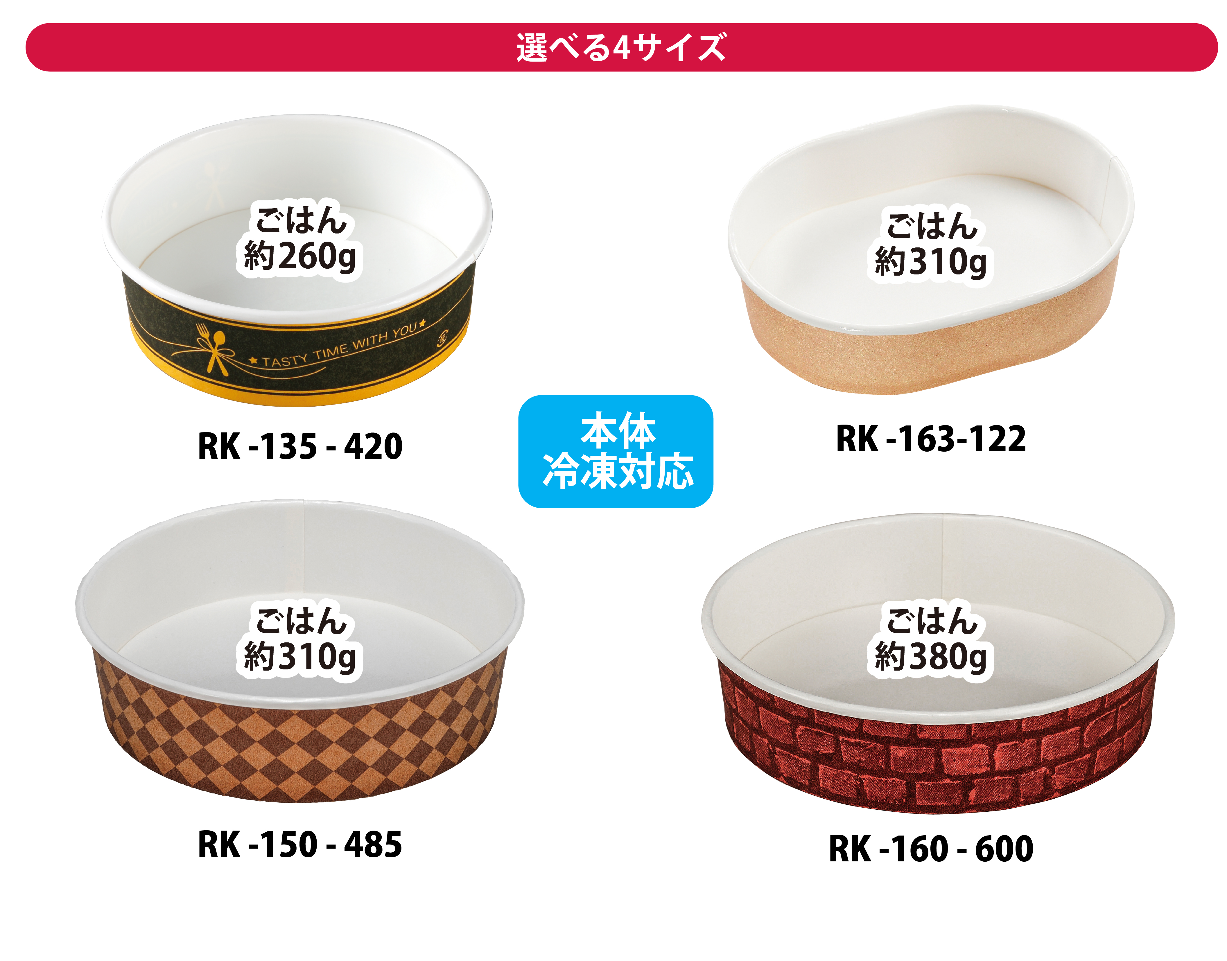 お客様のメニューや提供形態に合わせて、丸型・楕円形の容器を含む4サイズ(約260g~380g)をラインアップ!
