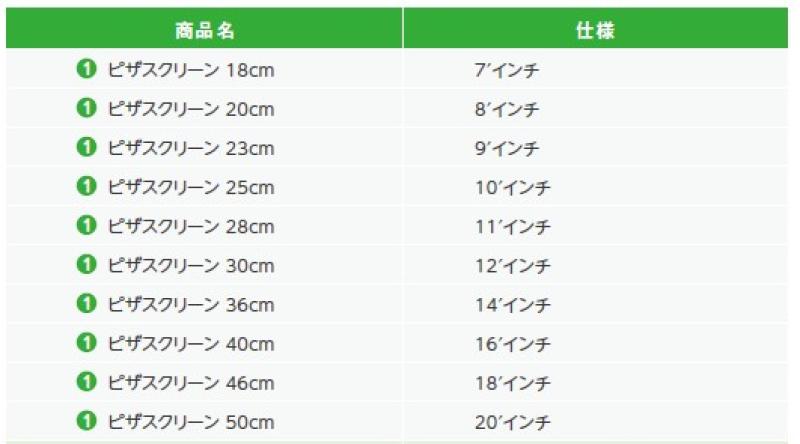 ネクストのピザスクリーンの特長は、豊富なサイズ展開にもあります。7インチ(直径18cm)~20インチ(直径50cm)の計10サイズの展開があります。