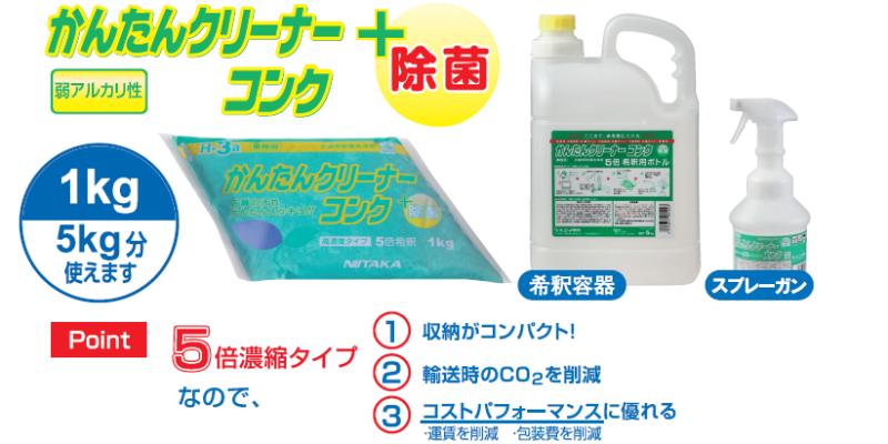 株式会社ニイタカの「かんたんクリーナーコンク」は、そんな現場の“洗剤多すぎ問題”を解消するマルチユース型除菌洗浄剤です。