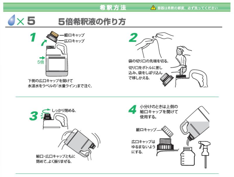 「①広口キャップに水を入れる → ②袋を切って注ぐ → ③軽く振る」だけ。複雑な作業が一切なく、清掃初心者でもミスなく希釈できます。