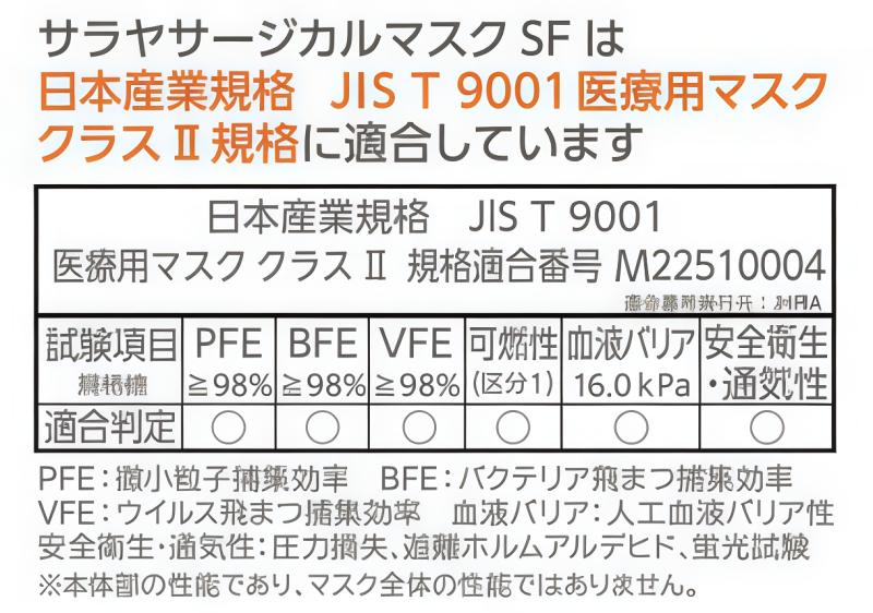 「サージカルマスク SF」の最大の特徴であり、キーポイントとなるのが、日本産業規格(JIS T 9001)医療用マスク クラスⅡ適合という公的な裏付けです。医療用クラスⅡに適合するためには、以下の厳格な性能基準をクリアしています。
