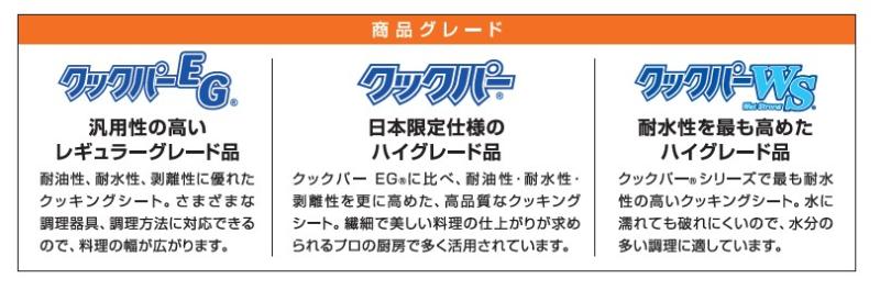 別注品は、用途に応じて以下3種類の原紙グレードから選択可能です。クックパーEG®タイプ:標準的な離型性・耐熱性を持ち、コストバランスに優れる主力グレード。
