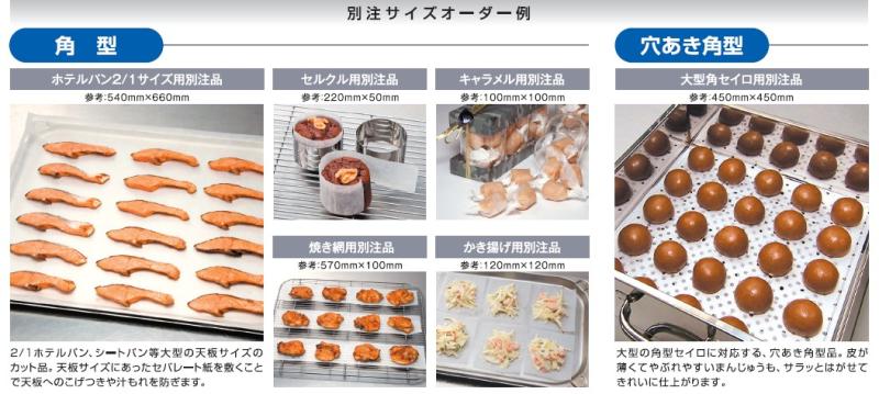 ホテルパンサイズ対応品は、スチコン調理や惣菜工場で人気。ロールを切る手間がなく、作業の均一化にも効果的です。セイロ用角型タイプは水に強く、蒸し料理でも破れにくいと好評。