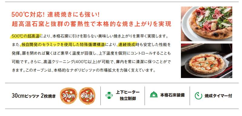 最大の特長は、500℃対応の超高温設計と、上下ヒーターの独立制御。ピザは上火だけでなく、下火(石床)での立ち上がりが味を左右します。