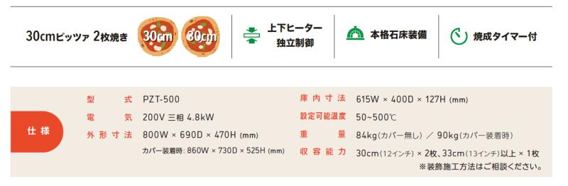PZT-500は庫内が横に広く設計されており、30cmピザを2枚同時に焼成可能。条件次第では、1時間あたり最大約80枚の焼成が見込めます。(条件により異なります)