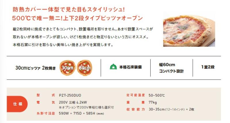 PZT-250DUO は、単なるピザオーブンではなく、売場の生産性と付加価値を同時に引き上げる提案型商品 として、武器になる一台です。