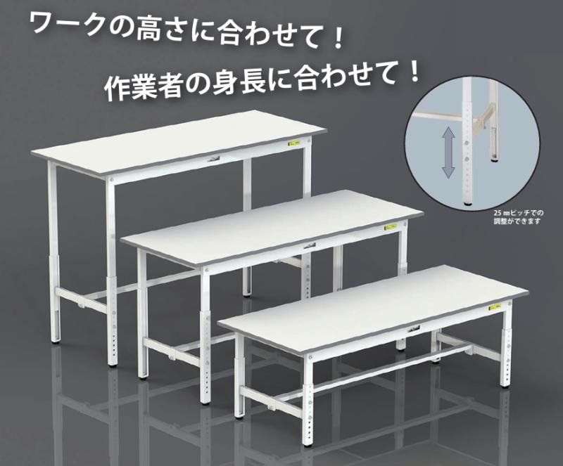 作業者の身長に合わせて、ワークの大きさに合わせて、25mmの細かいピッチで高さ調整が可能!正しい姿勢での作業は疲労軽減、作業効率アップ、品質の安定に繋がります。