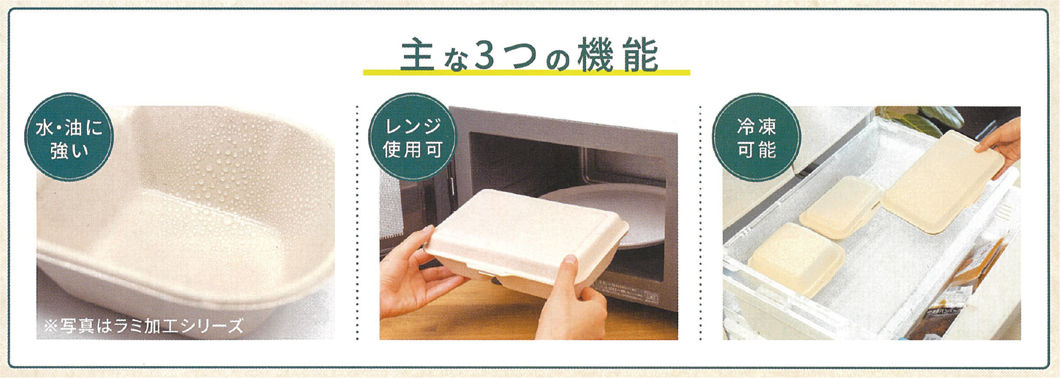 • 優れた機能性 高い耐水性・耐油性を備えており、油分の多い料理でも安心して使用できます。さらに、電子レンジでの加熱が可能なほか、冷凍保存にも対応しており、テイクアウトからデリバリーまで幅広いシーンで活躍します。