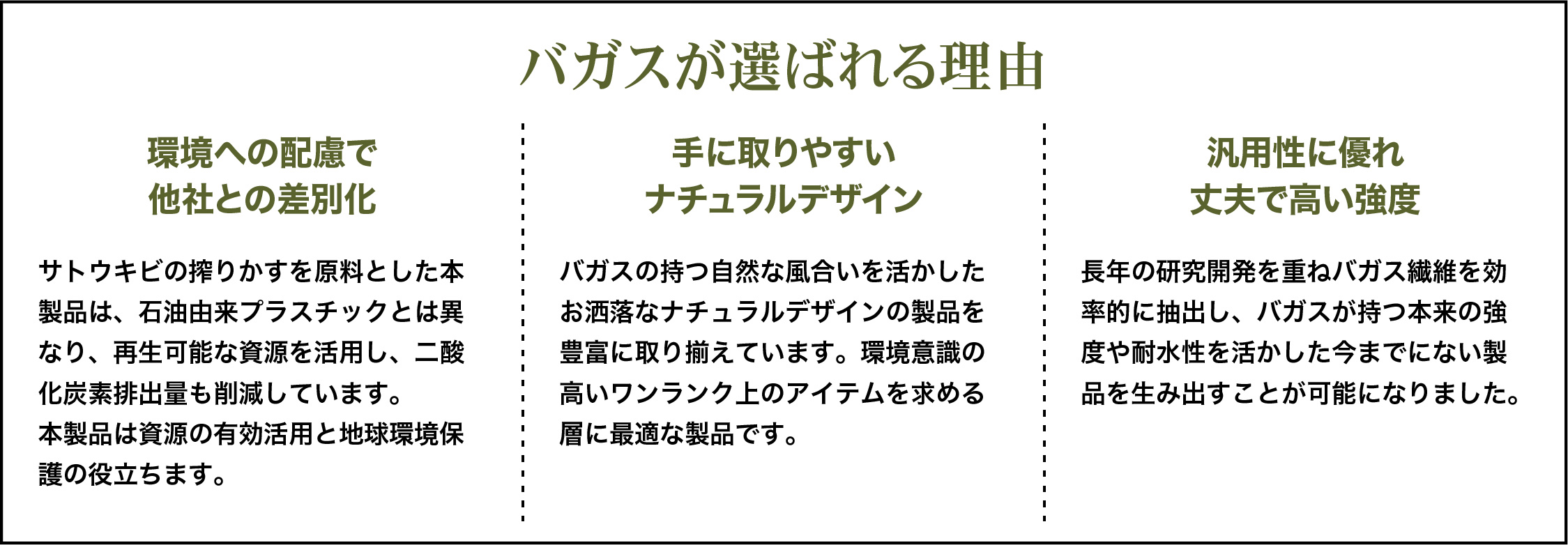 石油由来のプラスチックとは異なり、再生可能な資源を活用することで、廃棄時の二酸化炭素排出量を大幅に削減し、カーボンニュートラルな社会の実現に貢献します。