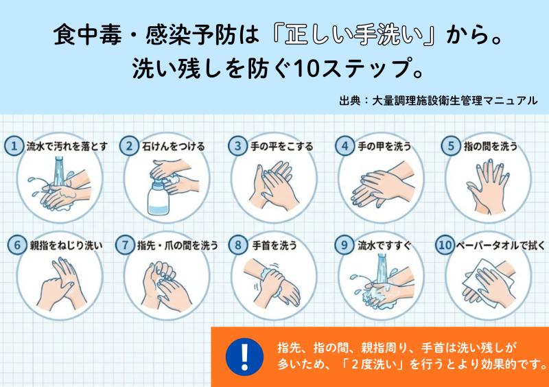 また、食品を扱う前や食事の前後、トイレの使用後には必ず手を洗うことで、食中毒や他の健康被害を防ぐことができます。