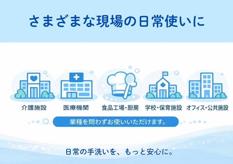 介護・医療施設、食品工場・飲食店、学校・保育施設、公共施設など、頻繁な手洗いが求められるさまざまな現場の「日常使い」に対応します。