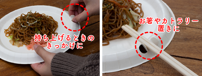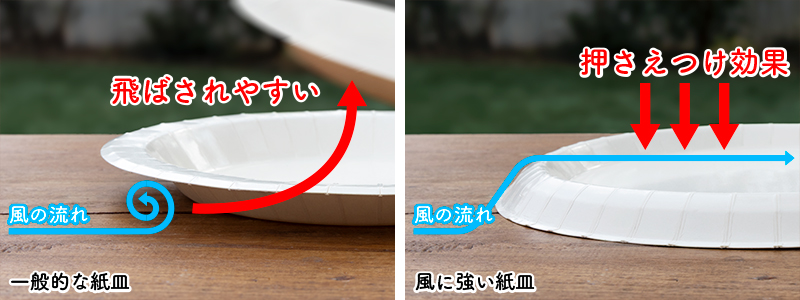これにより、従来の紙皿と比べて、風によるめくれや浮き上がりを抑えています。