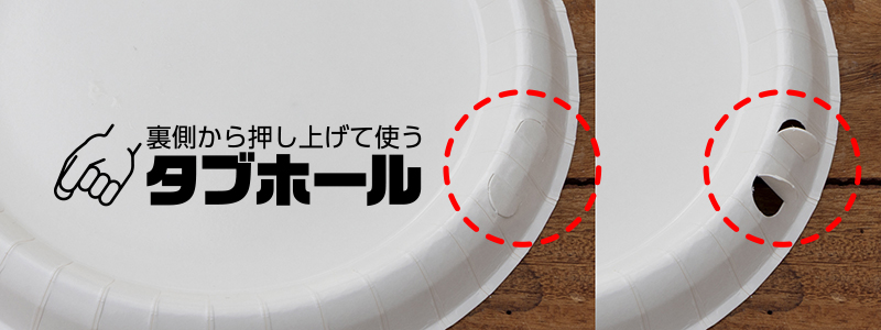 タブホールを設けることで、そのタブ(つまみ)をつまんで持ち上げる為のきっかけにすることができ、「皿を持ち上げにくい」という点にアプローチしています。