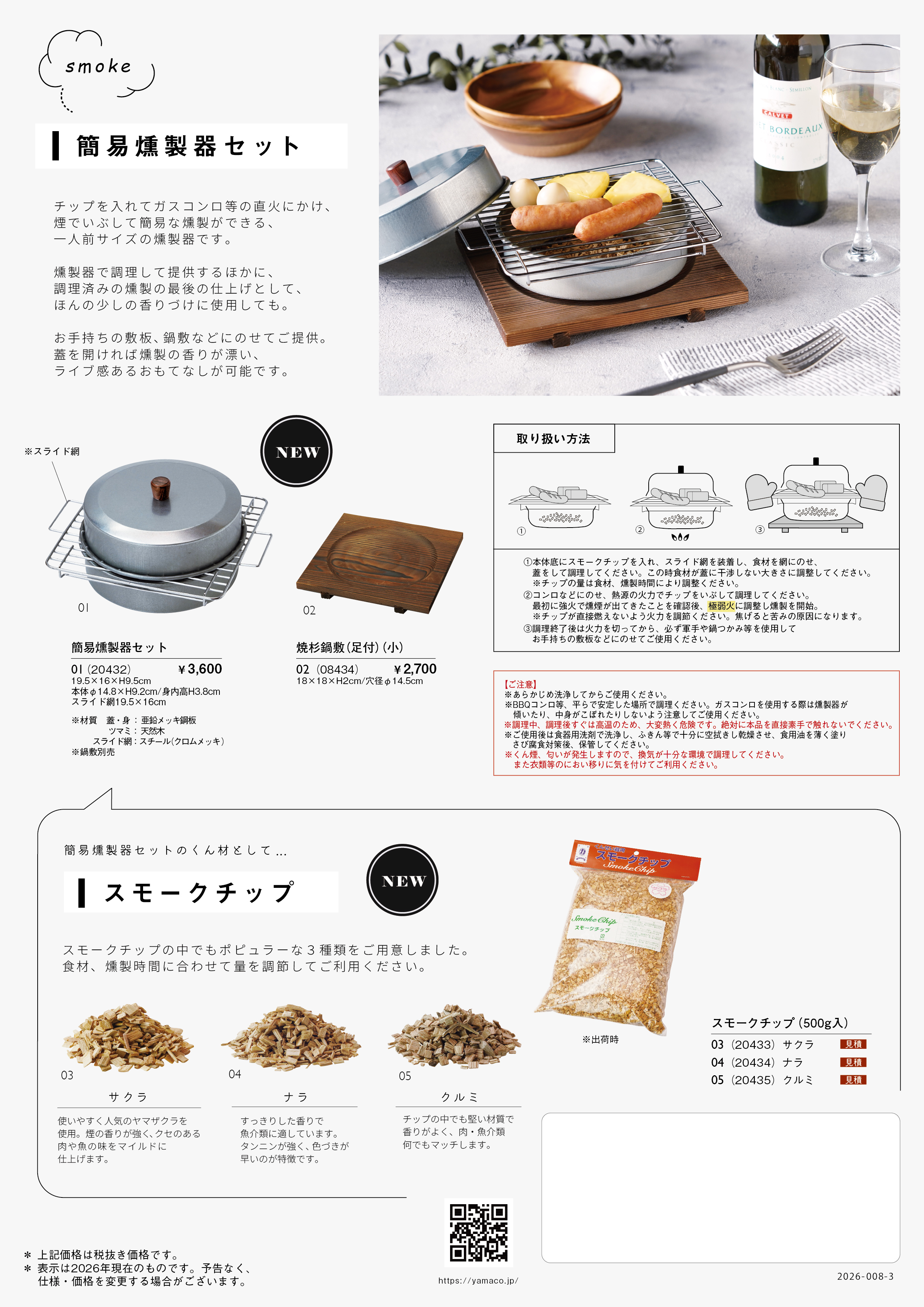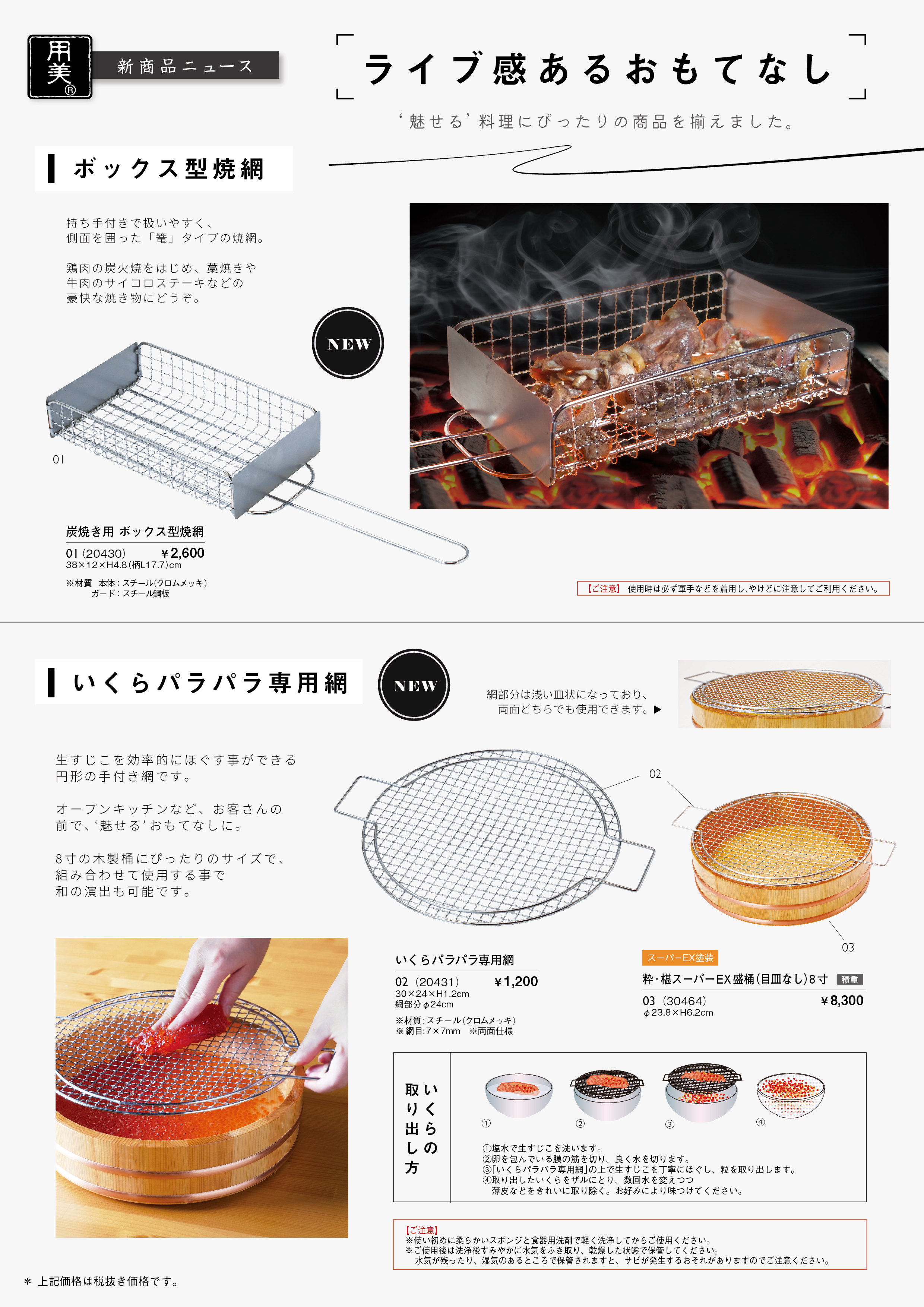 篭タイプの焼き網や、すじこをほぐす専用網、1人用鍋サイズの簡易燻製器セットなど、