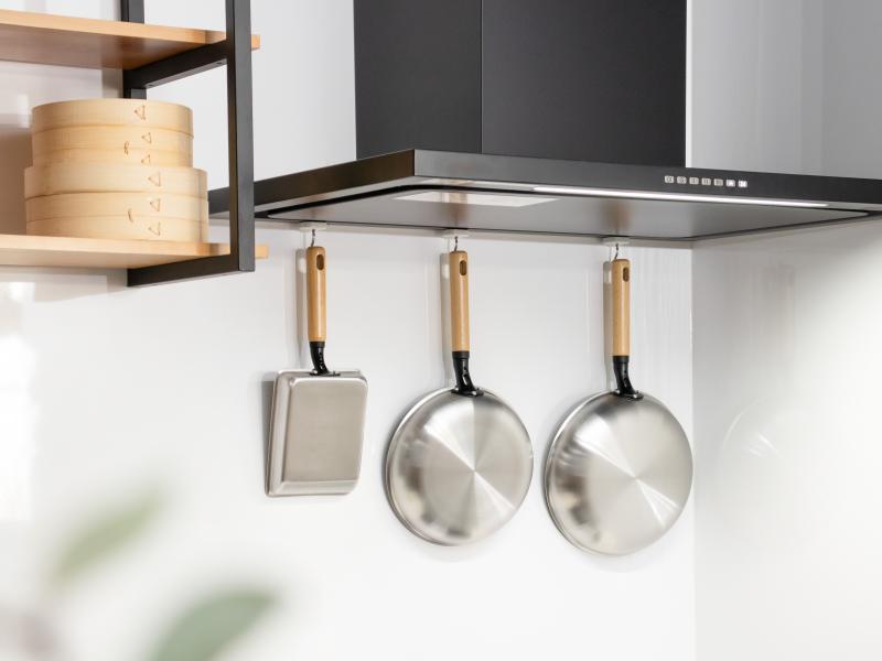 ハンドルには温かみのある天然木を採用し、手に馴染む心地よさとナチュラルな雰囲気が魅力です。外面はステンレスの上質な輝きが際立ち、キッチンに置くだけでやさしく洗練された印象に変わります。ハンドルにはフックが付いているため、吊るして収納すればステンレスの美しさと木目の柔らかさが調和し、キッチンインテリアにも自然に馴染む仕上がりに。