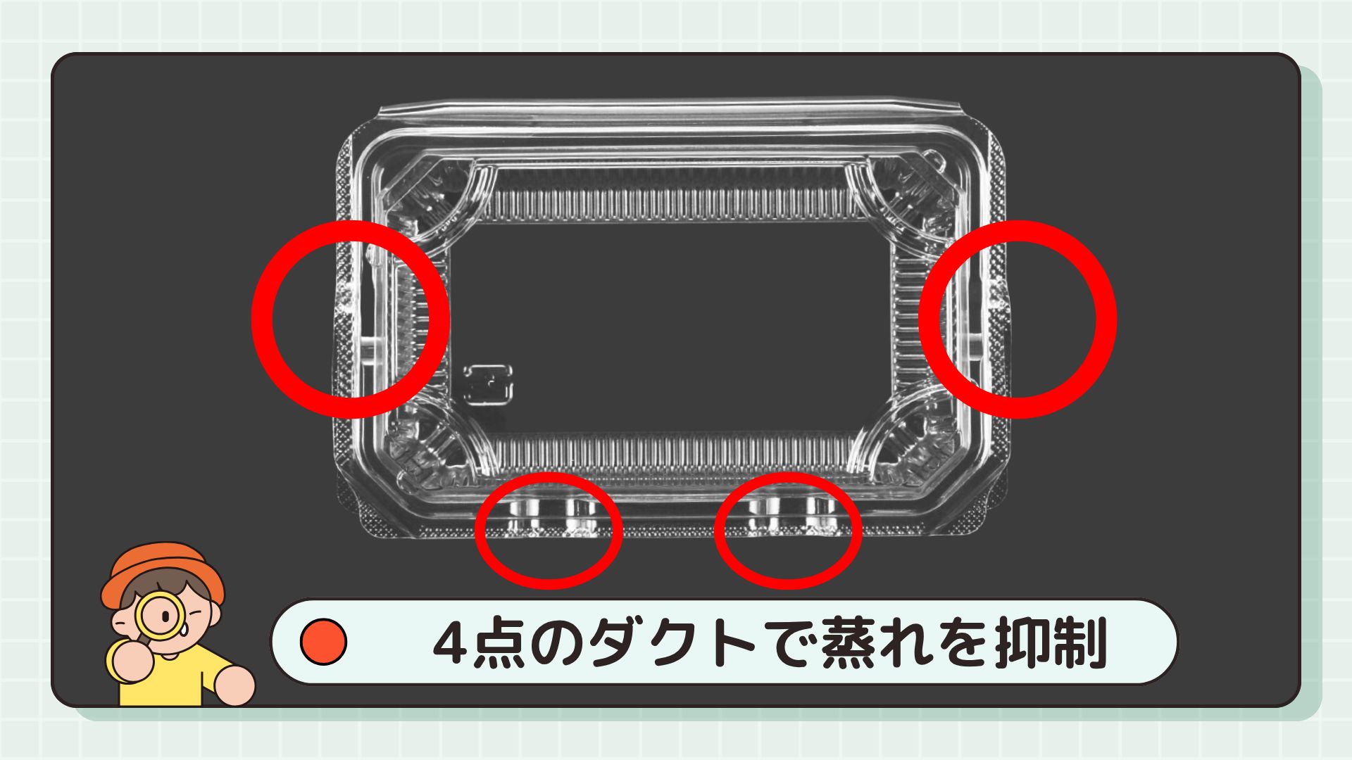 シンプルな形状ながら、容器内の蒸れを防ぎ、鮮度を維持します。