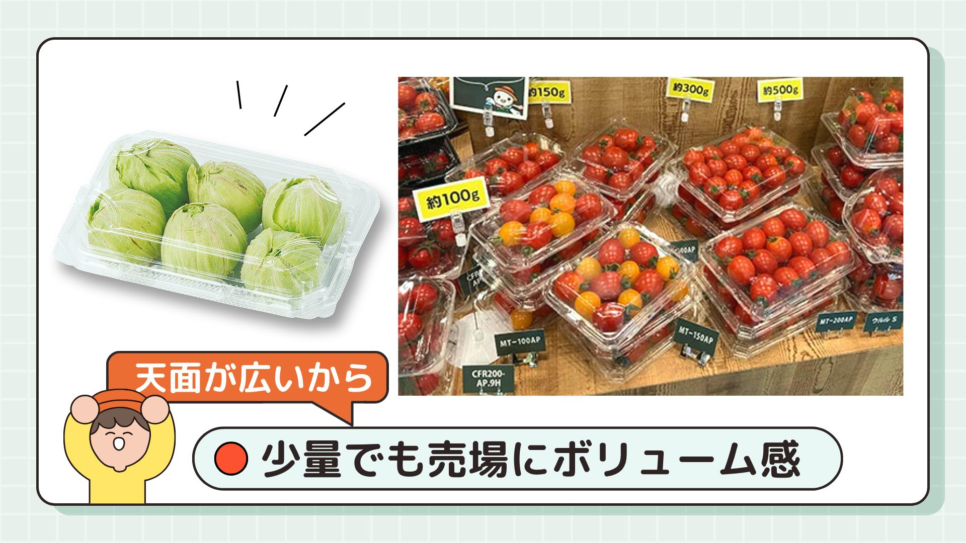 天候不順などで入荷量が限られる場合でも、少量陳列で売場の見た目を整えやすく、パック数を抑えながら売場を構成できます。