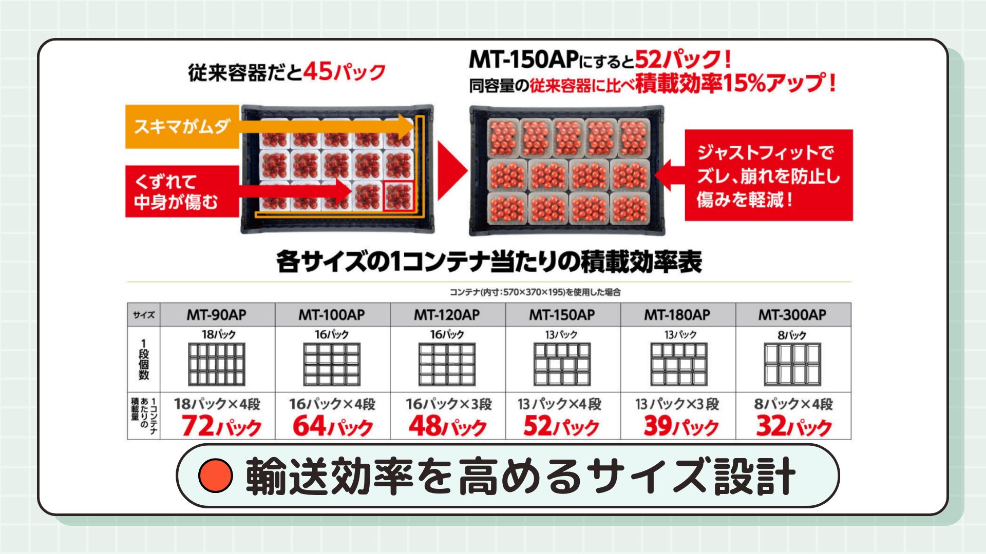 輸送コンテナにピッタリ収まるサイズ設計となっており、輸送効率UPに貢献します。