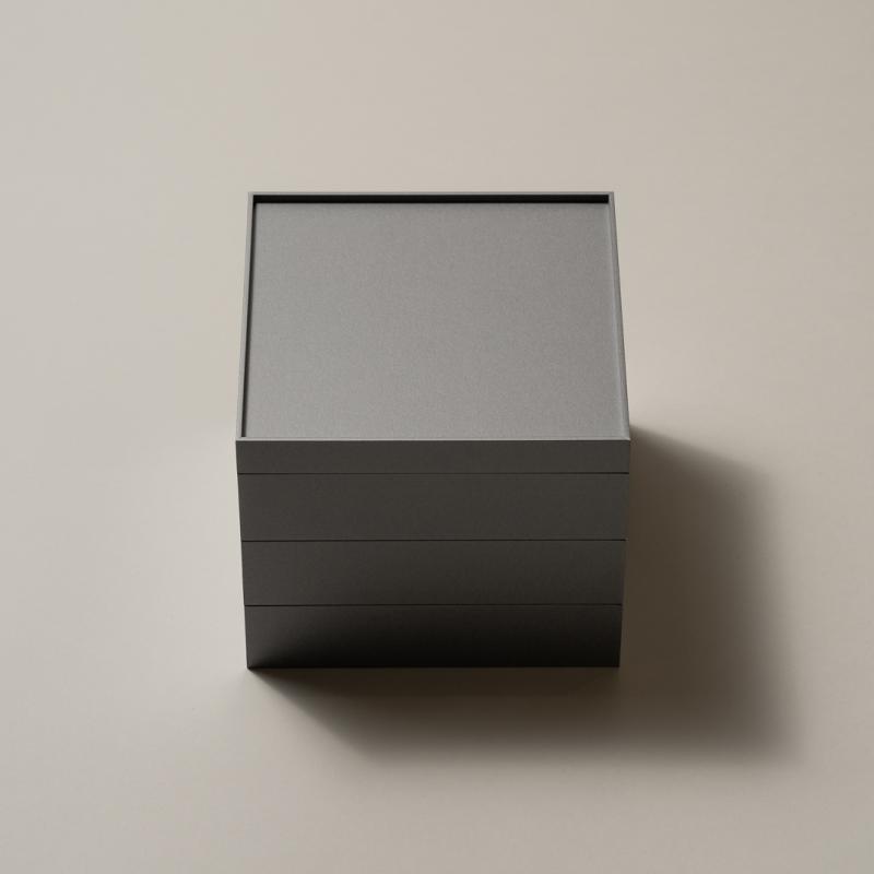 おせちの重箱として使われることを想定し、100%再生紙を使った板紙に、漆風・木目柄・マット調などの意匠を掛け合わせることで、上質な見た目と紙ならではの表現力を実現しています。