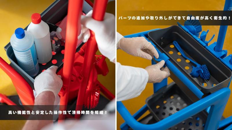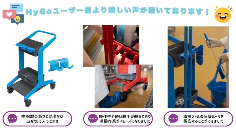 ・金属製の清掃ラックからHyGoに切替えました。樹脂製の為サビが出ない点がとても気に入っています。・操作性や使い勝手がとても優れており、清掃作業がスムーズに行うことが出来るようになりました。