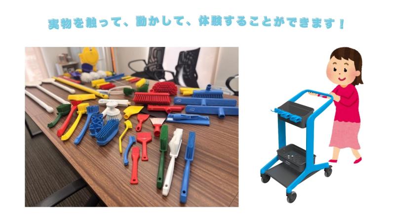 実際にHyGoに触れて頂き、軽さやスムーズさ、デザイン性、衛生性、カスタマイズのアレンジ方法等を実感していただければと思います!出張展示会では、様々はVikan製品を実際に手に取ることが出来ますので、カタログを見るだけでは分からない、使用するイメージがしやすいのがメリットです。気になった製品は実際にご使用いただけるデモ機(レンタル品)のご用意もございますので、ぜひご利用ください。