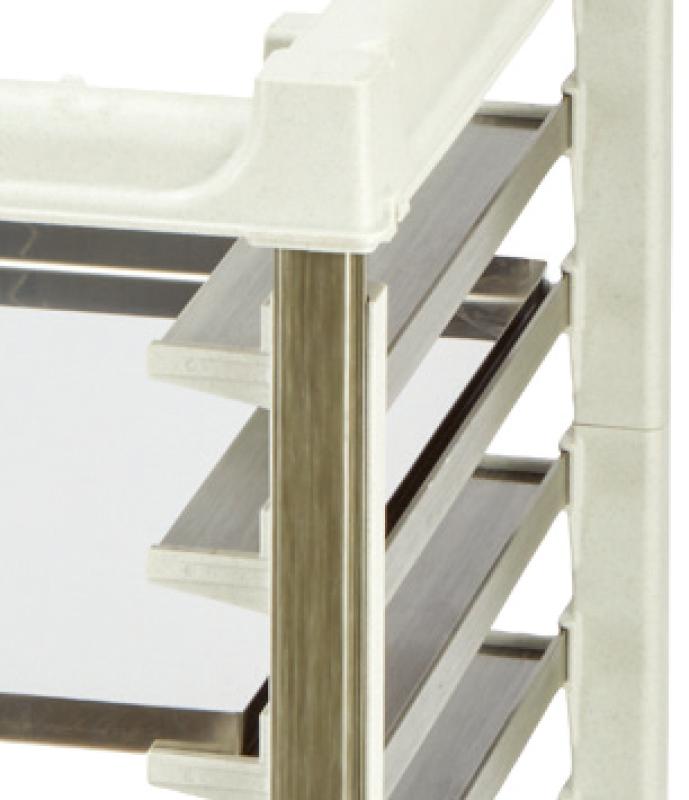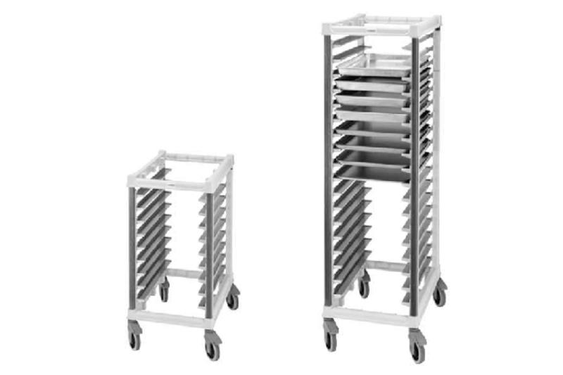 フルサイズ・ハーフサイズのGNパンを効率よく収納し、 厨房内でのスムーズな移動を実現するプロ仕様トローリーです。 金属部品を使用しない高耐久構造で、衛生的かつ長期運用に最適。 パンを傷つけない設計と広いレール間隔により、現場の作業性を大きく向上させます。