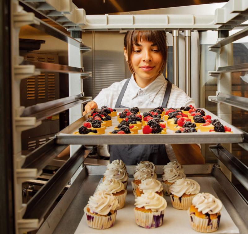 拡張レール構造により、焼き上がり直後の高温トレイもスムーズに出し入れ可能。オーブンからの移動もスピーディーに行えます。