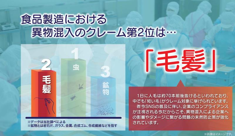1日に毛髪は約70本前後抜けるといわれており、中でも「短い毛」がクレーム対象に挙げられています。昨今SNSの普及に伴い、企業のコンプライアンスが注視される今だからこそ、異物混入による企業への影響やダメージに繋がる問題の未然防止策が強化されています。