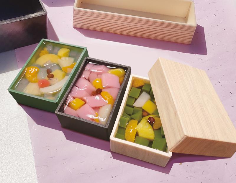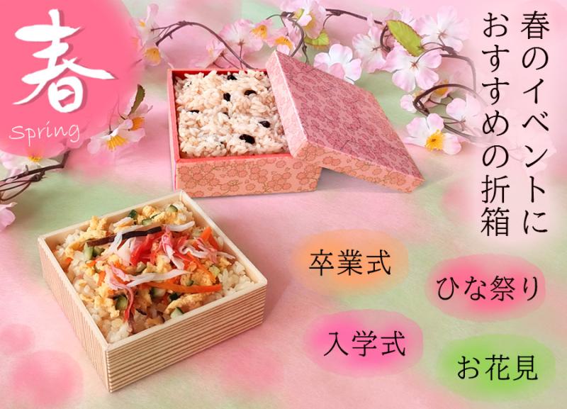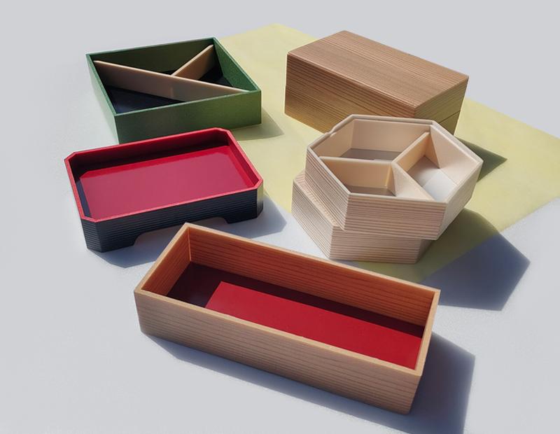 折箱は二段折や上げ底、角切、足くり、底板などバリエーションも豊かでお客様のイメージをより忠実にご要望にお応えすることができます。また仕切りを付けることによりお料理の盛り付けもより良く見せることができます。ギフトやおせち料理などで扱われることが多いです。