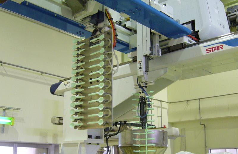人の手に触れずにスプーン、フォーク等を自動で個包装できるラインが弊社の強みです。