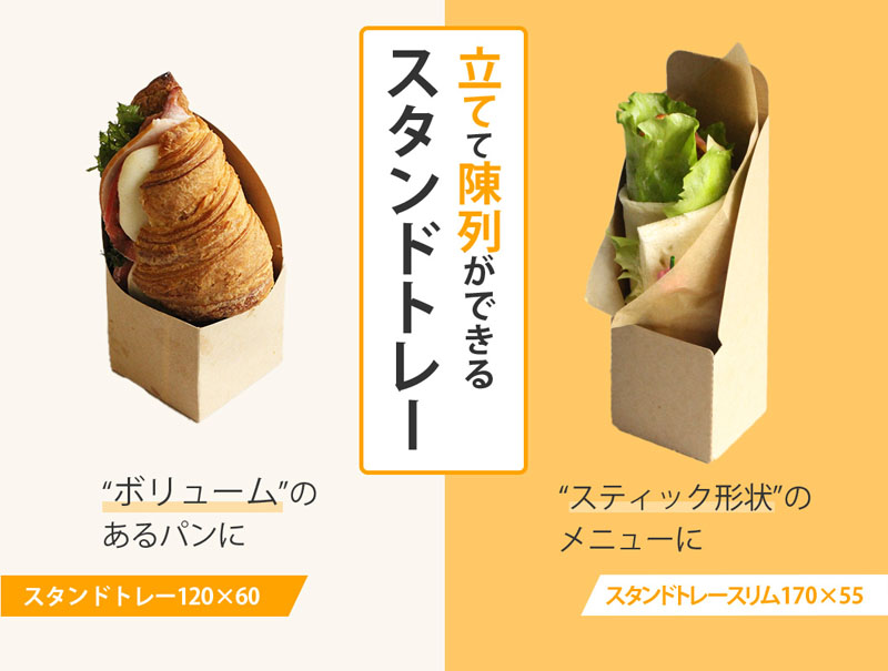 スタンドトレーはスティック形状のパンや具沢山のサンドイッチなどを立てて陳列することができます。